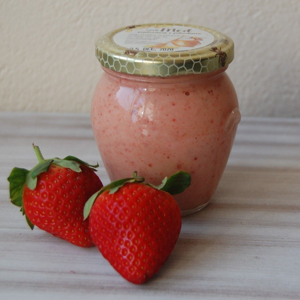 Kvetový repkový med zmiešame s mrazom sušenými jahodami, aby sa zachovali v jahodách všetky vitamíny.